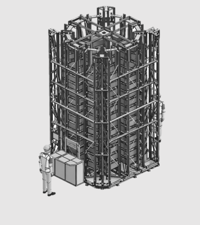 Unser Lagerturm benötigt eine Grundfläche von ca. 3,5x3m (je nach Ausgabeöffnung und Anzahl). Damit können auf einem sehr kleinen Foodprint eine große Anzahl an Behälter eingelagert werden, denn der Lagerturm nutzt die Höhe. Hier passen wir uns an Ihre Hallenhöhe bzw. verfügbare Höhe an.