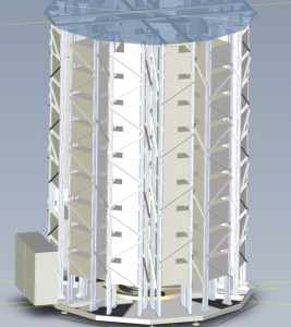 Der Lagerturm besteht aus 12 Regalfeldern und einem drehbaren Bediengerät, welches die Behälter ein- und auslagert.